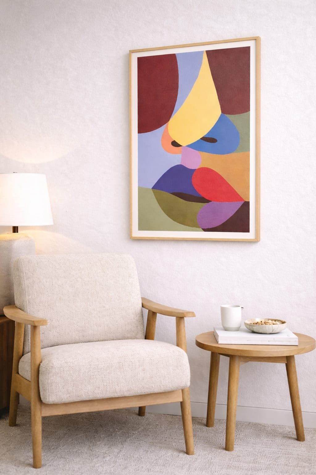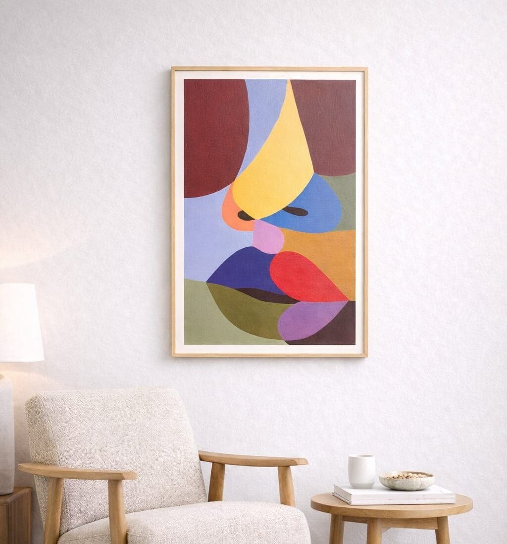 A refined abstract canvas artwork defined by soft organic forms and a harmonious interplay of colors.