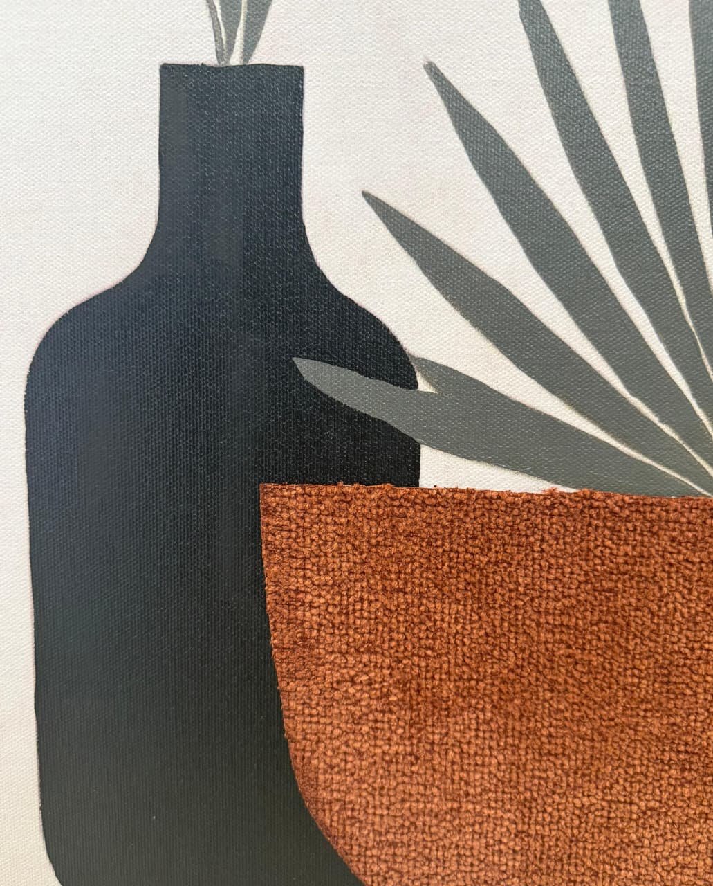 A refined botanical canvas artwork, hand-crafted using acrylic painting combined with modern fabric elements to create depth, texture, and visual contrast.