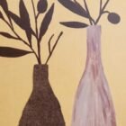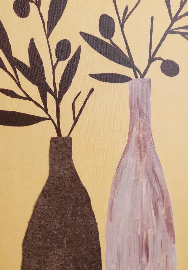 A refined botanical canvas artwork, hand-crafted using acrylic painting combined with modern fabric elements to create depth, texture, and visual contrast.