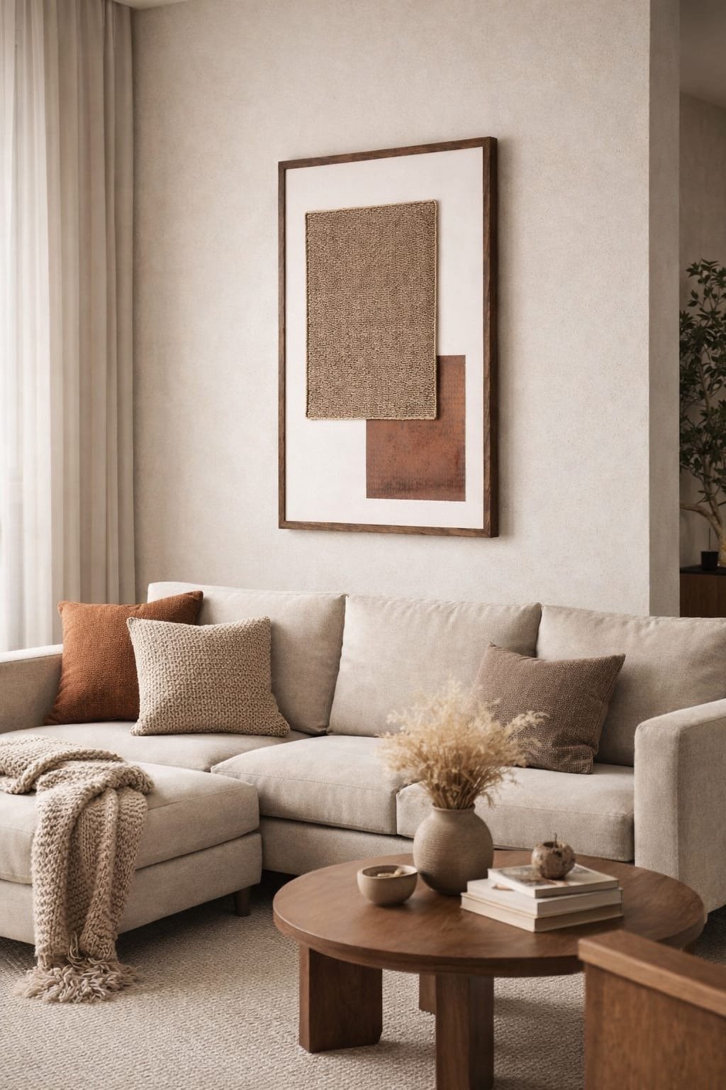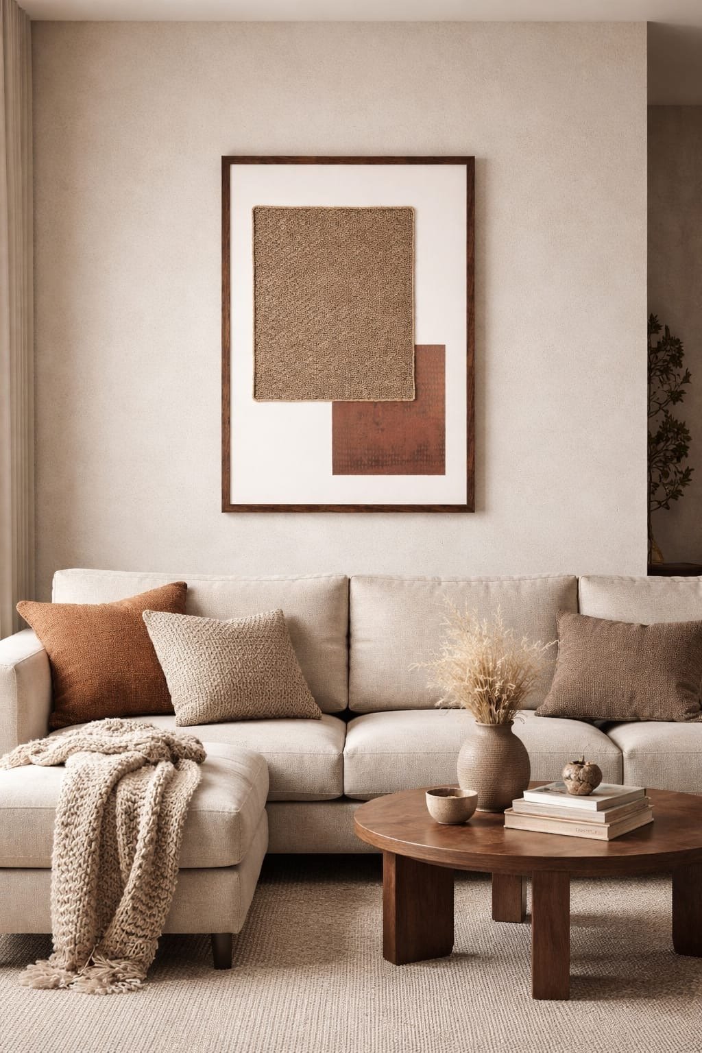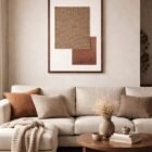 Its vertical 62 × 87 cm format makes it perfect for living rooms, consoles, or statement corners — adding depth, softness, and a grounded aesthetic to any neutral interior.